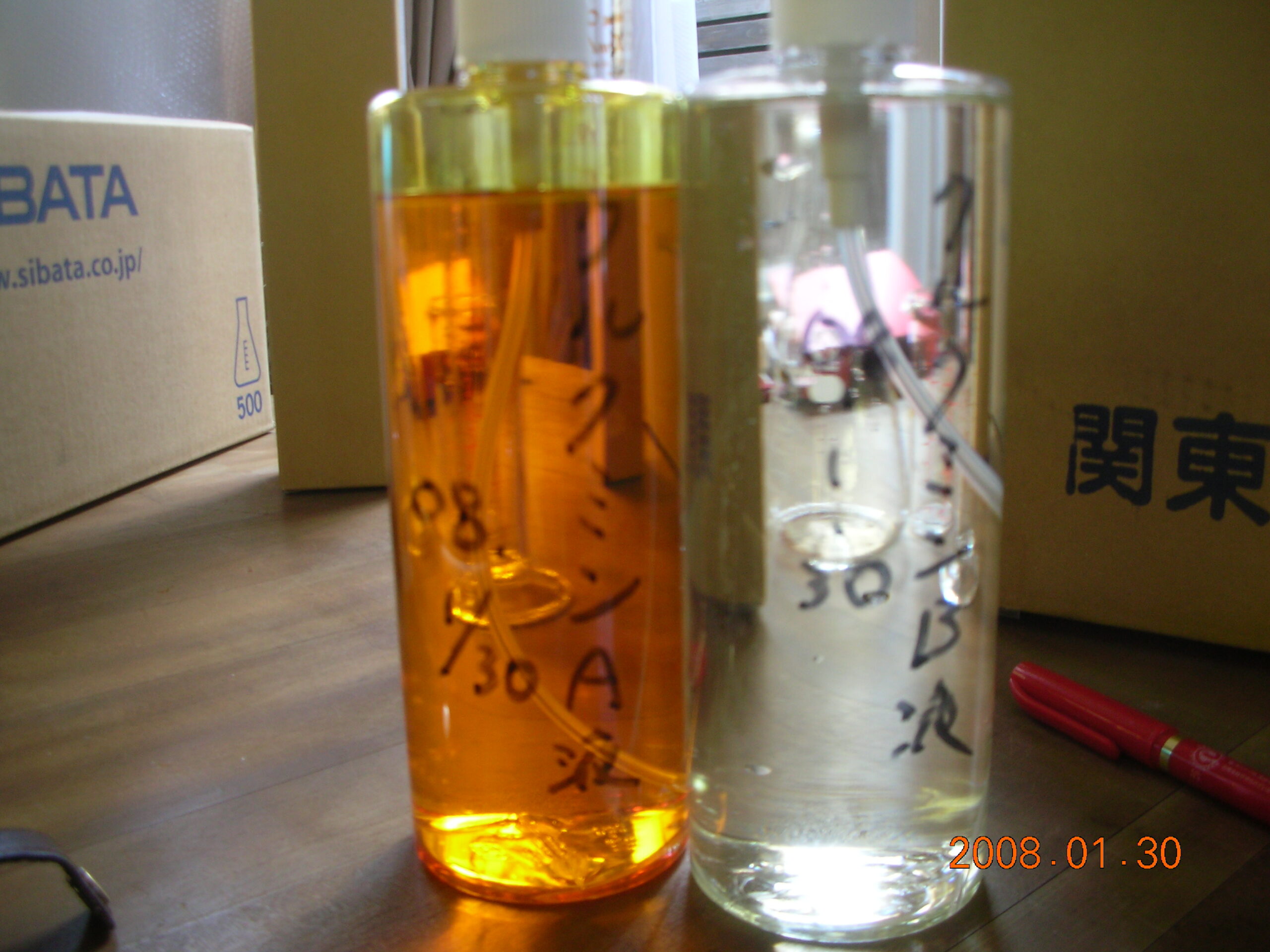 中央部のこのACQの入っていない部分まで、ホウ酸を浸潤させている。呈色反応で赤い部分(各左の赤色部)がホウ酸浸潤。