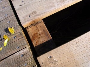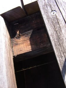 無処理のソフトウッドの方、ウッドデッキの大引きと床材の接触面ですでに腐朽がみられた。