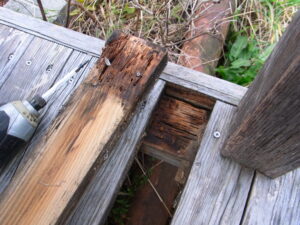 床材が色を変えたのは、紫外線による色変化で問題はないけれど、この床材と大引きとの接触面に水分が滞留し、大引き、床材とも腐朽し始めていた。