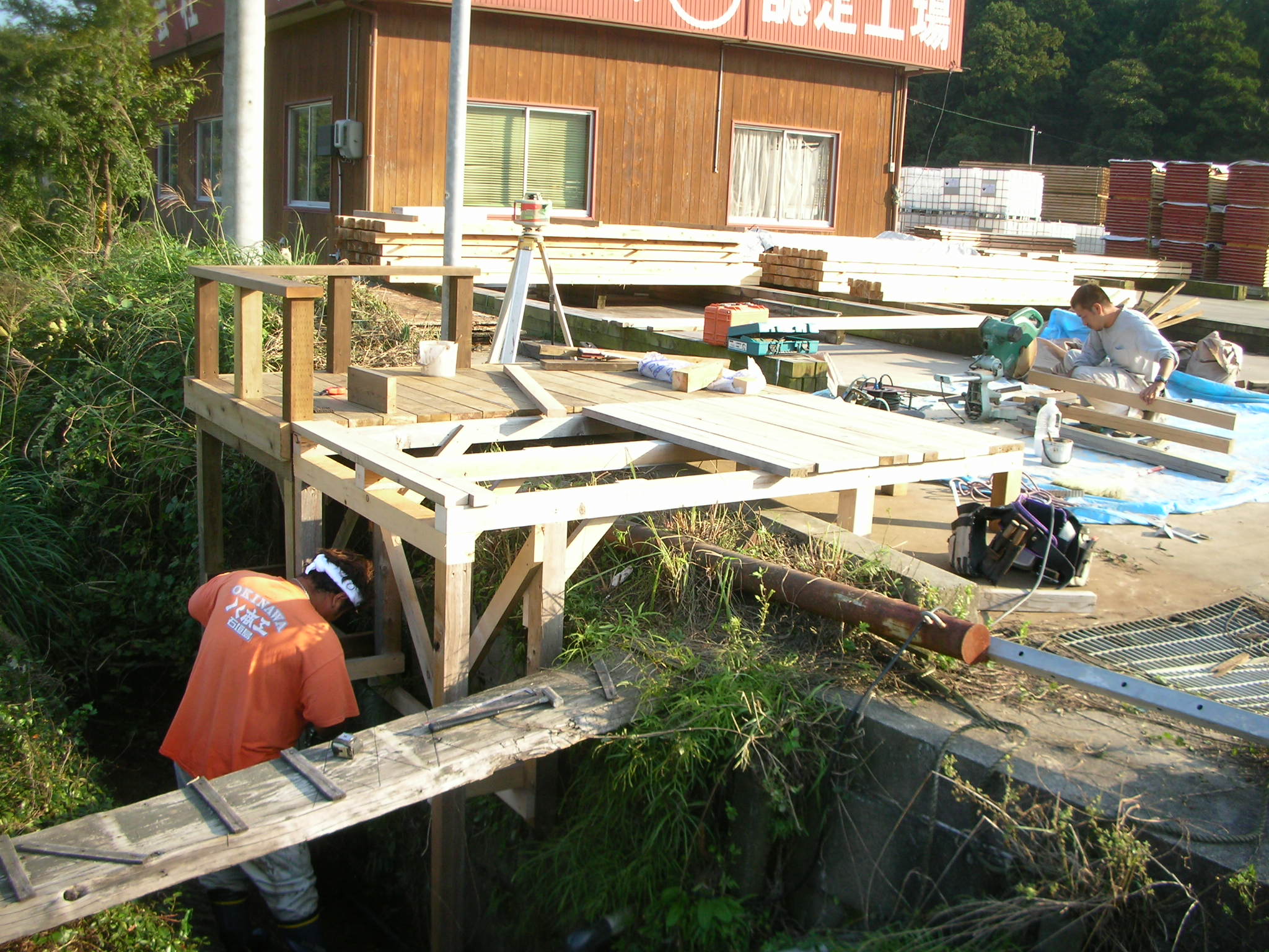 2008.10.15~16に工場でLBウッドと、無処理のソフトウッド(ここでは、ヘム、ファー使用)のウッドデッキを並べて作った。