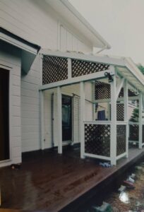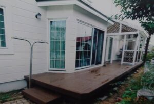 湘南の陽光が降り注ぐ鎌倉市、南面にウッドデッキの上、コンサバトリー。(ガラスで囲ってはいない、囲うと夏の暑さではとんでもないことに・・)・・と現実に引き戻される