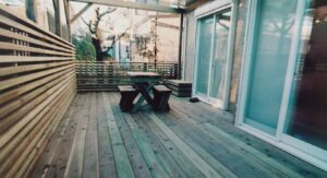 国産材をACQを加圧注入し、ホウ酸を減圧注入の上、シリコンゴムを浸潤させて作られたLBウッド。これを駆使して少し空気が緩む空間を造る。