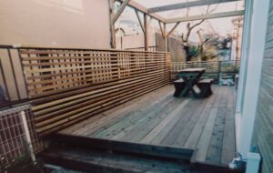 水平の横桟が遠近感を作り出し、途中のパーゴラが立体感で視線をひろげる効果がある