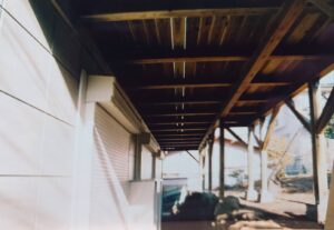 地面から高くはないが低くもない。柱をなるだけ減らすために、大きな桁。そして大きく持ち出すため大きな梁。