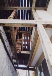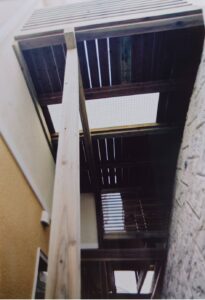 一階の下から構造を作ってベランダと、見かけ上お隣さんの土地でに見えるがご自分の土地一杯まで広げました