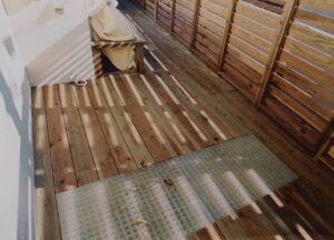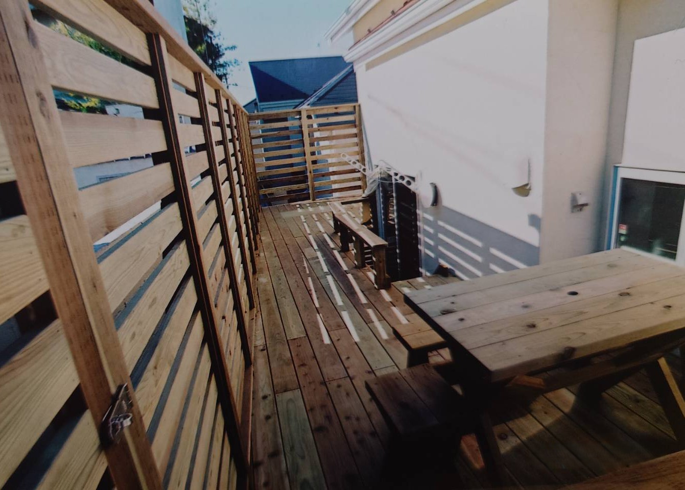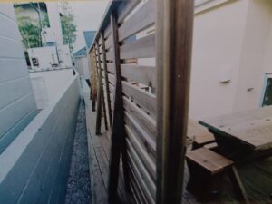お隣さんの敷地に数十センチ入り込んだところが敷地でかつ、二階にウッドデッキを作ると、そのまま平らに敷地いっぱい使えるということ。