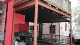 柱を車の出入りを考えて、階段に寄らせたので、桁がむき出しになる所は木屋根。