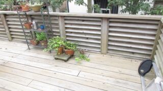 ウッドデッキのディテール 完成写真のアーカイブ集(2013年・6月)・・船橋市の木製フェンス・門構え、秦野市のアール系の車庫上デッキ(ガレージデッキ)