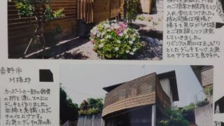 船橋市の玄関の木製フェンスと木製ゲート。和風だが、少し欧風という絶妙なデザインに。また秦野市の車庫上デッキは鉄骨を躯体にしてその上に高耐久処理の材で少しづつ曲線に。