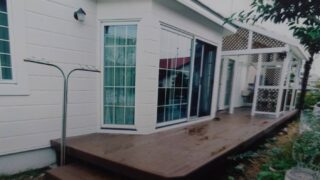 1階ウッドデッキ 鎌倉市の塗装済みのウッドデッキと、白と茶色のコンサバトリー風、ホワイト基調