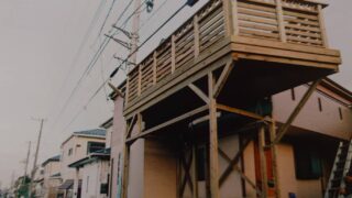 既存バルコニーの一部を解体(解体の場合、防水は一番重要)木製バルコニーの上でBBQすると言われたので、あるお客様のアイデアをお借りして、テーブルの下に防火の鉄板をひいた一方のデッキがより飛び出しているので方杖を飛び出させて、更に構造の柱を2...