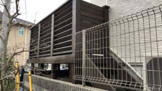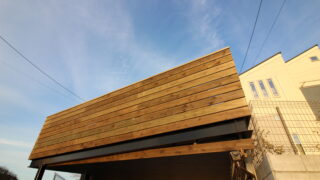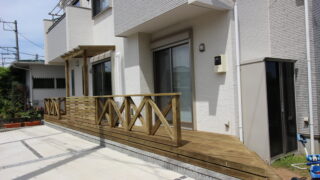 1階ウッドデッキ 明るい陽光と開けた土地の解放感有り・・横浜市南区のウッドデッキと屋根のついたパーゴラ、そしてウッドフェンスを風が吹き抜ける