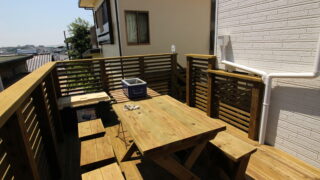 1階ウッドデッキ BBQやりたくなるのウッドデッキ・・川崎市多摩区の開放的スキップフロアー ちょっと高い居間の前のウッドデッキから少し上ると、車庫上デッキ(ガレージデッキ)で陽射しも明るい、アウトドアの一等地夕間暮れ、細い明かりがほんの少し夜を引き立てる。バーベキュー(BBQ)、やわらかな日差しの時期には盛り上がります。 2025.11.03 BBQガレージデッキ川崎市多摩区1階ウッドデッキ