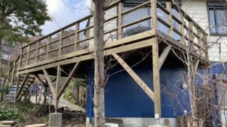 ウッドデッキ工事(施工) 別荘のウッドデッキ(ハイデッキ)の工事の動きを紹介します・・・静岡県賀茂郡東伊豆町の避暑地のウッドデッキ 建て方は雨中。必ず現場担当の工事社員が下見して、準備を充分にして伺った変形のウッドデッキですが、こうした工事もLBウッドは対応します。晴れた日には、海が見えます二階が玄関。地面から階段で上ります。弊社は、工事は自社の社員(社員が職人)という... 2026.02.13 ウッドデッキ工事(施工)デザインナチュラル別荘のウッドデッキ木製バルコニー賀茂郡東伊豆町