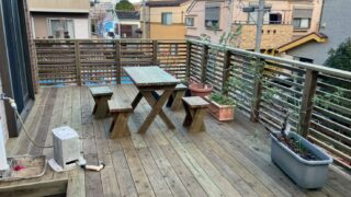 ウッドデッキ工事(施工) 鉄骨を再利用でメンテナンスして、ハイデッキのカーポートデッキを施工・・・横浜市旭区 鉄骨の上に、土台を廻す。鉄骨と木の土台の間で熱伝導を低く抑えるために固形のゴムパッキングを挟む木製フェンスを廻す冬の工事は日中が短く工事は、ライトが入る仕上がった、LBウッドのウッドテラス(下は車庫) 2026.03.22 お子さまの遊び場こどもの遊び場ウッドデッキ工事(施工)ウッドフェンス(木製フェンス)ガレージデッキデザイン木製バルコニー木製フェンス、ウッドフェンス横浜市旭区自社職人車庫上ウッドデッキ