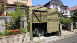 ウッドデッキ工事(施工) ドアがついた車庫上ウッドデッキ(ガレージデッキ)のハイデッキ、駐輪場・サイクルポートで上ではアウトドアリビング・・横浜市泉区 玄関の横からすぐ、広いウッド・ヤード樹木を記念樹として楽しみつつ、せり出す半島のようなイメージ駐車場の中が見えないように上にあげて開く扉をつけています。扉の作り方は、土地の条件で様々できるのですが、使いやすい扉を選択されました 2026.03.09 お子さまの遊び場こどもの遊び場ウッドデッキ工事(施工)ガレージデッキデザインナチュラル横浜市泉区車庫上ウッドデッキ
