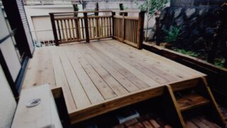 1階ウッドデッキ 一部低い木製フェンスでアクセントを付けた横浜市緑区のウッドデッキ エアコンの室外機を置くため、デッキの一部を欠き込んだ。道路と意識下では、境界をつくるというイメージで背の低いウッドフェンスを立てています。ここで、フェンスが無ければ、広がる感じは出やすいけれど、自宅と公共の道路とは分けたイメージというのも、... 2026.04.22 ウッドフェンス(木製フェンス)木製フェンス、ウッドフェンス横浜市緑区自社職人1階ウッドデッキ
