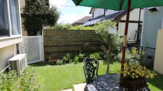 木製フェンス、ウッドフェンス 緑のビーチパラソルと黄の花が主役・・横浜市青葉区のウッドフェンス(木製フェンス)も主張しない、おとなしめで 花の向こうに見えるウッドフェンス高耐久で腐りにくい、耐久化処理した国産材のLBウッドでの木製フェンスが、植物の草木と似合うのです。ウッドフェンスで目に見える素材感同士の和音も、出来上がるような気がします 2026.01.17 木製フェンス、ウッドフェンス横浜市青葉区