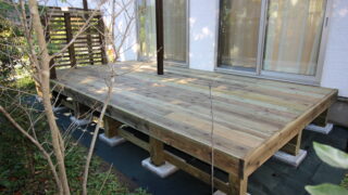 1階ウッドデッキ 2階のバルコニー下に屏風立ちするウッドフェンスとウッドデッキの工事・・・古都鎌倉に似合う、静かなエクステリア 最低限の囲いをウッドフェンスでお庭の植栽が目に優しい、それを楽しめる柔らかなウッドデッキ何とはなしに、ささやくような声しか出ない静寂感があります 2026.02.08 ウッドデッキ工事(施工)ウッドフェンス(木製フェンス)ナチュラル鎌倉市1階ウッドデッキ
