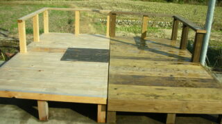 1階ウッドデッキ 海外政治動向に左右されにくい国産木材を改質しウッドデッキなどのエクステリアに使えるようにしたLBウッド実験 日本木材保存協会の長い取り組みとその成果の果実を頂きながら、弊社は実際に木材を改質する社員、現場でそれを使って施工する社員の創造力を伸ばすため、工場で実際にLBウッドの実験デッキを2008.10.15~16で作った。短期の実験でもわかること... 2026.04.03 ウッドデッキのディテールウッドデッキ工事(施工)意見や議論湖西市理論・実験、その他自社職人1階ウッドデッキ